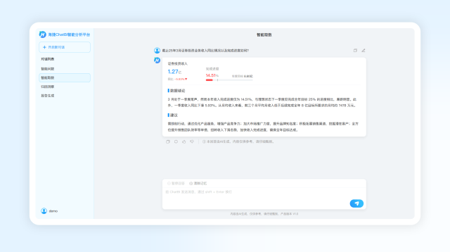 智能取数:用户以自然语言提问数据相关问题后,大模型依据对问题的理解,在数据库中精准定位并提取所需数据。它会采用文字描述与图形展示相结合的方式,将数据清晰直观地呈现给用户,使数据信息更易于理解和分析 。