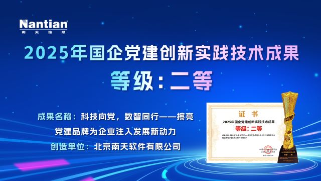 中国企业文化研究会在不断探索、深入研究党建与企业文化建设的理论创新和实践融合的背景下,面向全国开展“2025年国企党建创新实践成果”评选,旨在深入总结国企党建工作创新经验,扎实推进新时代、新征程国企党建创新工作发展,为企业高质量发展提供有力保障。本次共有来自全国范围的1000余项申报案例,经专家组审定,最终评选出创新成果356项,共设三个等级。南天软件“科技向党,数智同行——擦亮党建品牌为企业注入发展新动力”案例被评定为“2025年国企党建创新实践技术成果”二等等级。