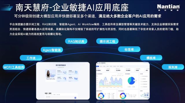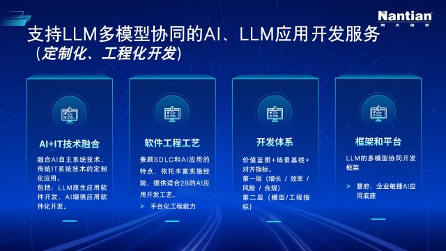 LLM多模型协同的定制化与工程化AI服务是以南天信息自有的AI技术组件、产品为基础,围绕客户的业务核心竞争力构建定制化技术方案与实施路径,通过对AI与IT技术的高效集成,实现低成本、高效率的交付目标。通过工程化服务引入“RAGOps、AgentOps、DataOps”等体系,能够为客户提供既具专业深度又兼具成本优势的整体解决方案及其交付服务。