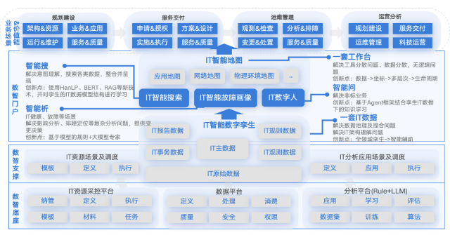 南天信息数智IT管理解决方案不同于传统“工具堆砌”模式,方案聚焦于构建“物理IT实体世界”与“数字孪生虚拟空间”的全域精准映射,对IT技术、组织、知识、规则进行体系化建模,凭借“开放可编程”的采控、调度、数据开发能力整合 CMDB、运维大数据等各类数据,进而构建有定义、有生命、有联系的IT数据资产。小到物理服务器的运行状态,大到业务应用的交易链路,均能在数字世界中精准呈现,实现“业务-逻辑-物理” 三层关联。同时以“数智工作台”为核心运营载体打通IT管理全流程智能化链路,最终形成“数据驱动-智能分析-科学决策-高效执行”的全周期管理闭环,为企业IT系统的数字化转型、智能化升级与精益化运营提供核心技术支撑。