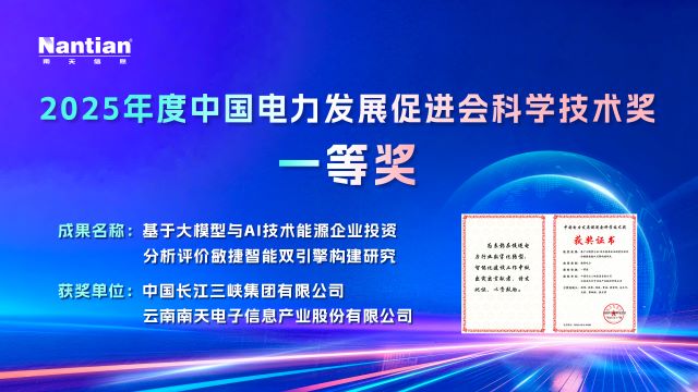 近日,2025年度中国电力发展促进会科学技术奖获奖名单发布,南天信息与三峡集团共建的“基于大模型与 AI 技术能源企业投资分析评价敏捷智能双引擎构建研究”成果获得一等奖。