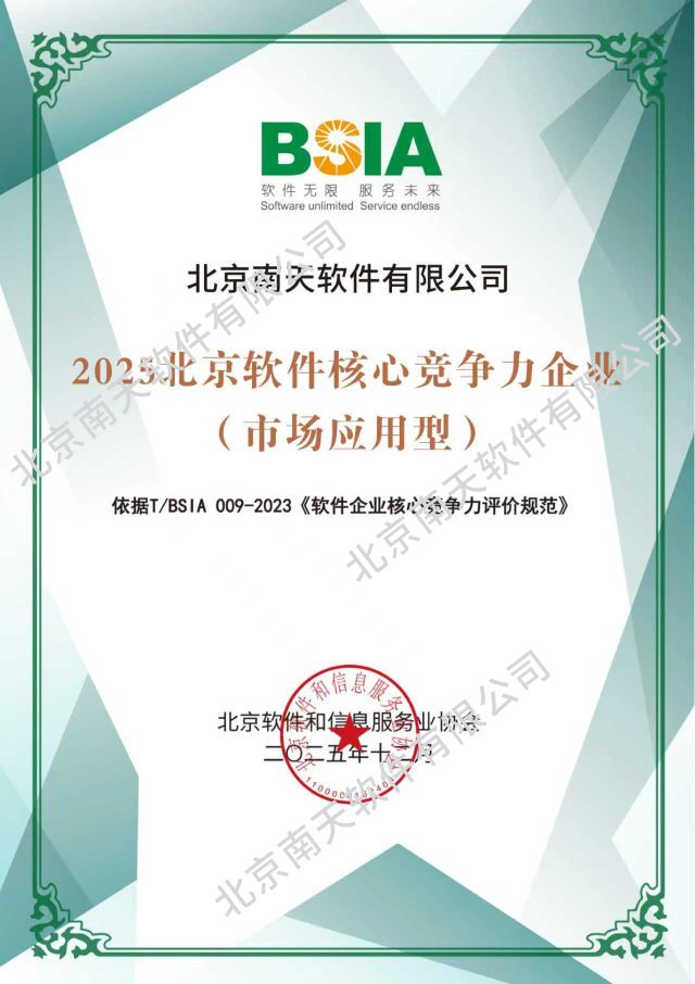 “2025北京软件核心竞争力企业”榜单评选,依据最新升级的《软件企业核心竞争力评价规范》(T/BSIA 002-2023)团体标准,针对产业带动力、技术创新力、市场影响力、业务前瞻性等核心竞争力,评价出平台赋能型、技术研发型、市场应用型、业务探索型四大类型企业。南天软件自2019年首届入选后,连续七年荣登该榜单。