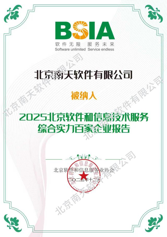 “2025北京软件和信息技术服务综合实力百家企业”榜单评选参照了中国电子信息行业联合会的软件和信息技术服务竞争力企业评价,并以《软件企业核心竞争力评价标准》(T/BSIA 002-2023)为基础,聚焦北京市行业内业务规模大、效益好、自主创新能力强的优秀企业,围绕企业的经营现状和发展潜力,量化衡量企业综合实力。南天软件多年荣登该榜单,正是行业对其在技术研发、创新能力、经营规模及品牌价值等方面持续积累的综合实力所给予的肯定。