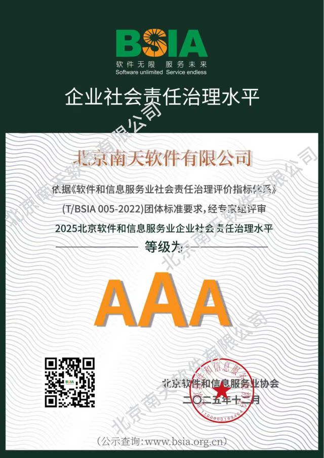 “企业社会责任治理水平”榜单评选,依据《软件和信息服务业社会责任治理评价指标体系》(T/BSIA 005-2022)团体标准,从责任治理、经济责任、社会责任、环境责任四大核心维度,对企业社会责任治理的系统性、规范性和成效性进行全面评估,南天软件凭借完善的社会责任治理体系和扎实的责任履行成效,获评“企业社会责任治理水平最高级AAA级等级”认证