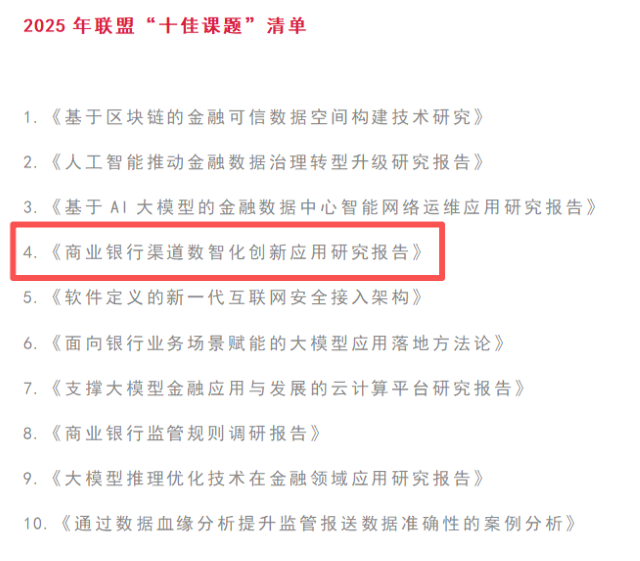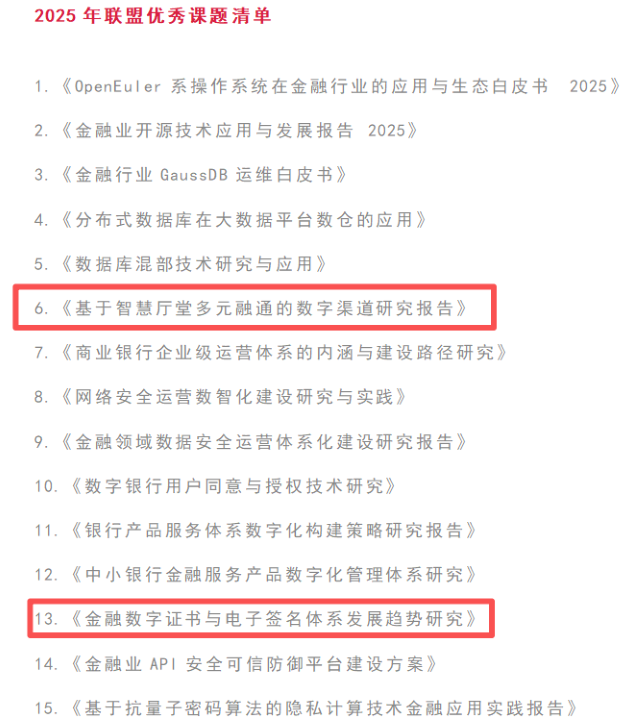 近日,北京金融科技产业联盟第三届理事会第六次常务理事会在京召开,审议通过2025年度联盟工作考核结果,其中南天信息与多家国有大行、全国性股份制商业银行及行业合作伙伴参编的《商业银行渠道数智化创新应用研究报告》获评“十佳课题”,《金融数字证书与电子签名体系发展趋势研究》《基于智慧厅堂多元融通的数字渠道研究报告》获评“优秀课题”。