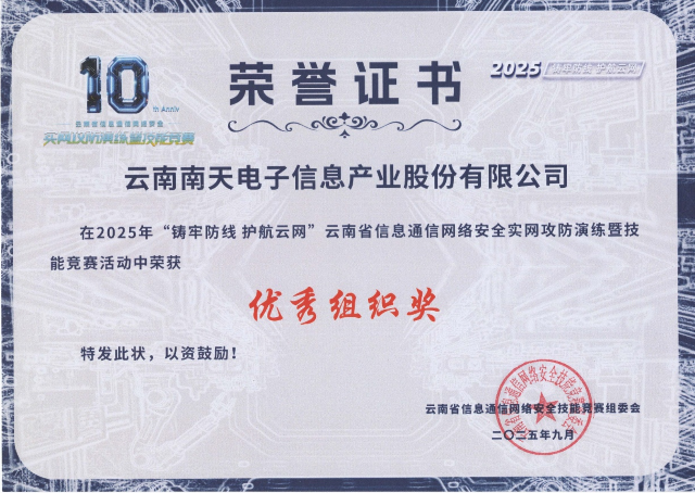 近日,由云南省通信管理局联合省公安厅、省工业和信息化厅共同主办的2025年“铸牢防线护航云网”云南省信息通信网络安全实网攻防演练暨技能竞赛圆满落幕。南天信息凭借扎实的技术功底、高效的应急响应机制以及精准的防守策略,在全省40余家重点工业互联网和增值电信企业中脱颖而出,是唯一全程未失分的参赛单位,并荣获“优秀组织奖”。